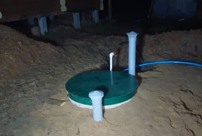 Если на участке нет естественного уклона, отсутствует канава, овраг или кювет, в таком случае дренажный колодец — подходящее место для отвода очищенной воды. Монтируйте его недалеко от септика, на дно — щебень. Вода самотёком из станции попадает в него, а дальше рассасывается в грунте. Бывает, что на участке уже есть дренажный колодец — тогда инженеры устанавливают станцию очистки и сброс организуют в него.